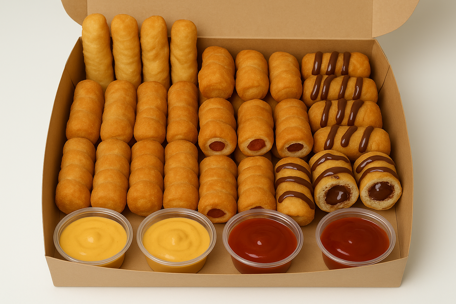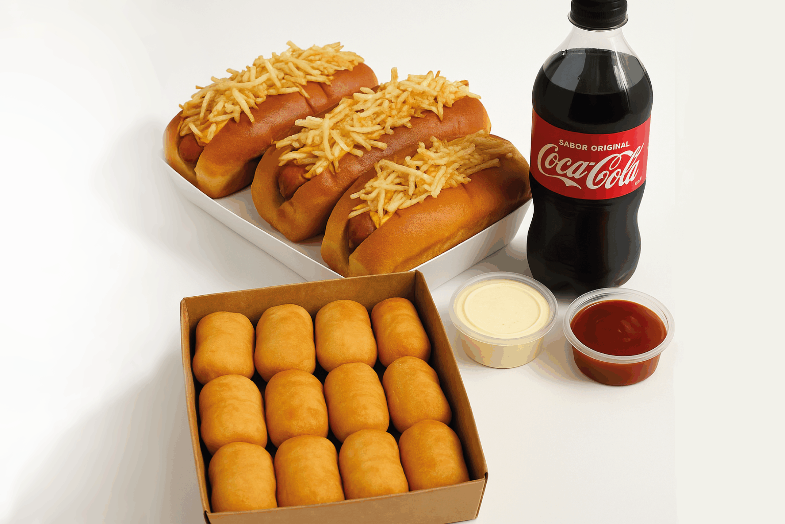 12 jojoteños + 12 coctelitos + 12 tequeños de chocolate + 4 salsas
